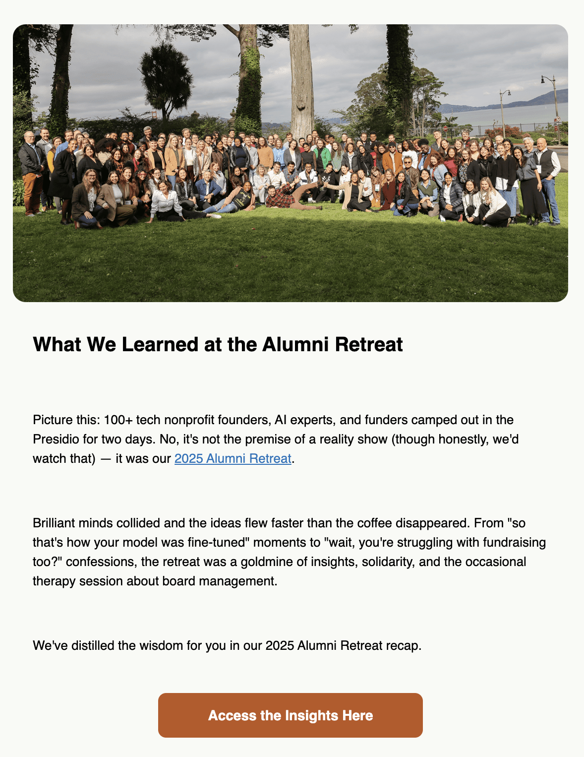 The ask: Write high-impact email newsletter copy that spotlights nonprofit founders, drives engagement, and makes complex topics (like AI ethics) feel urgent yet accessible.